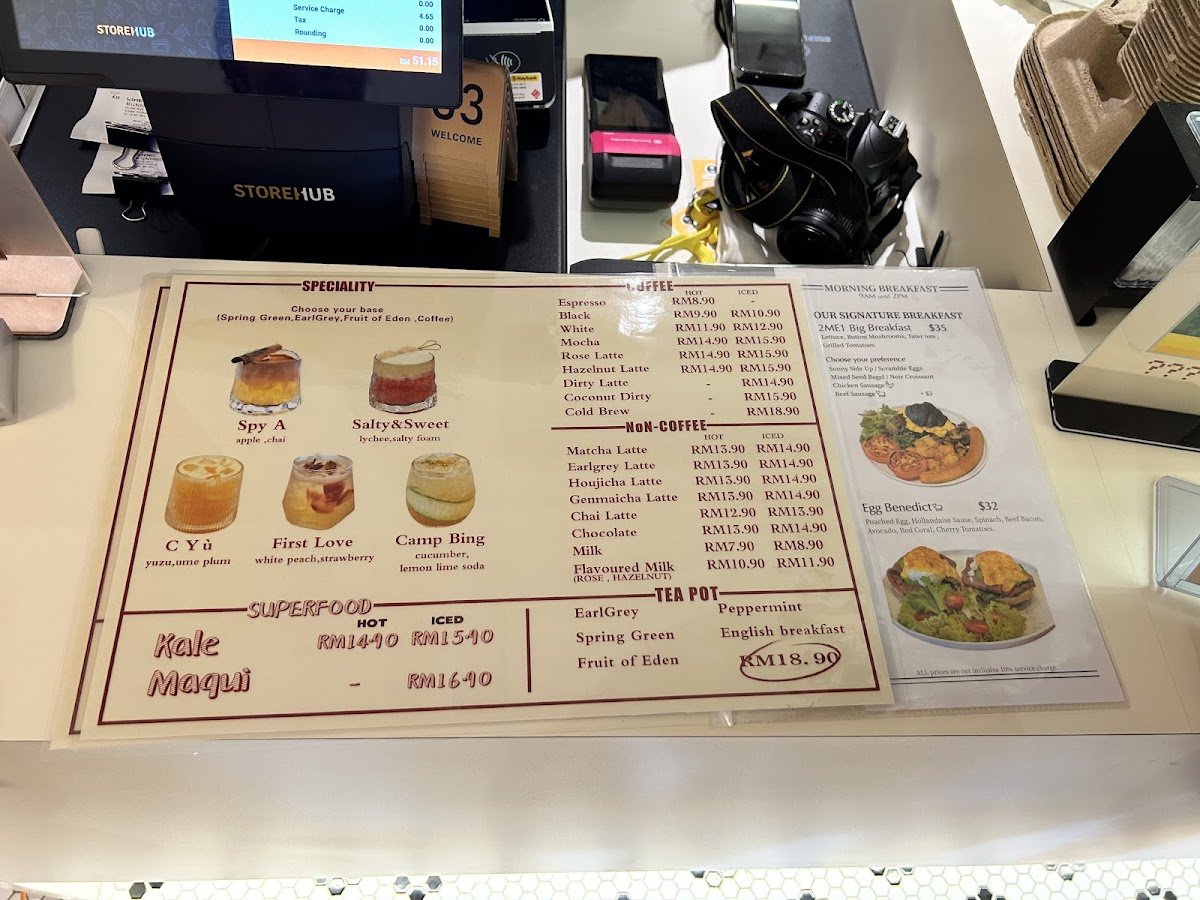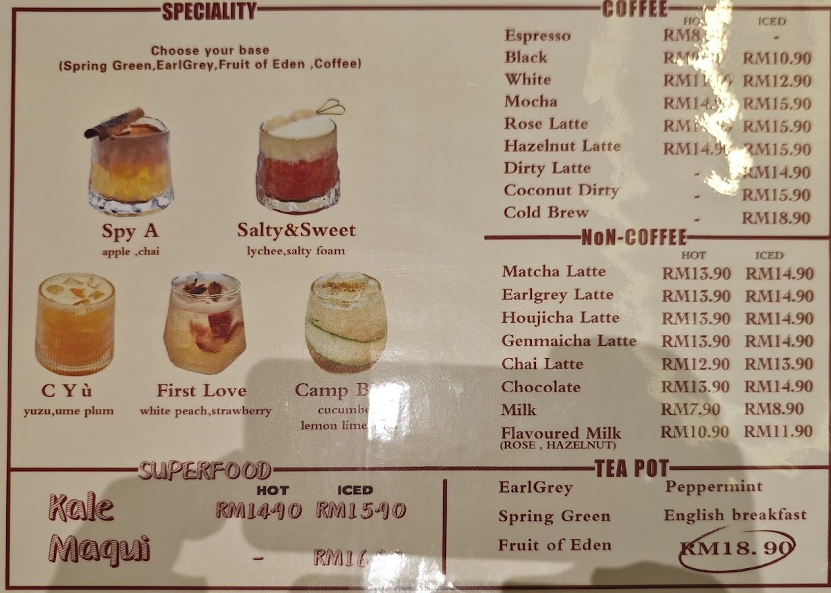The menu caters well to customers looking for quick orders, light meals, or coffee breaks. Pricing is indicated before SST, and the variety allows guests to choose from sweet and savory pastries, specialty coffee drinks, and light meal options.